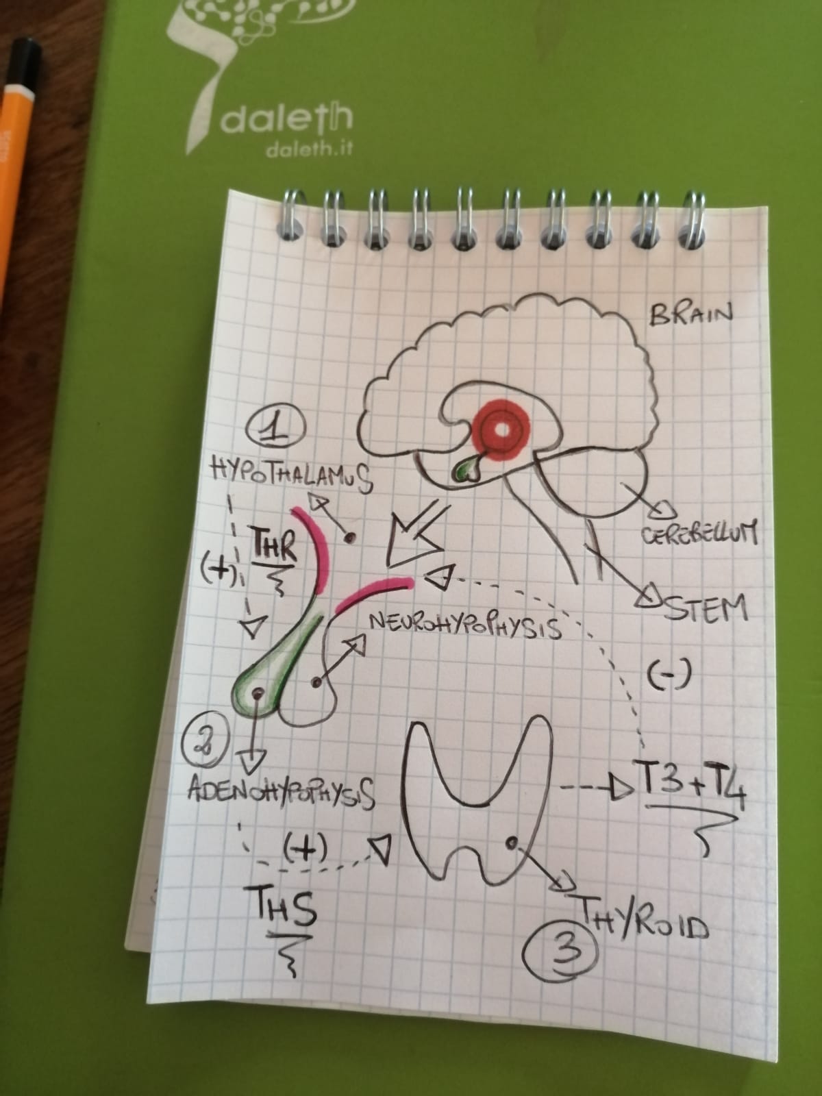 In order not to cause confusion, I deliberately omitted another key element of the axis. In fact, the pituitary gland is not the primary regulator of this process. In fact, the production of these hormones depends on another portion of the brain directly connected to the pituitary gland: the “hypothalamus”. In the case we are temporarily interested in, namely the pituitary-thyroid axis, the production of the hormone TSH by the pituitary gland is regulated in turn by the hormone TRH, produced precisely by the hypothalamus.